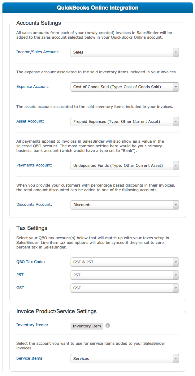 - All sales amounts from each of your (newly created) invoices in SalesBinder will be added to the sales account selected below in your QuickBooks Online account.