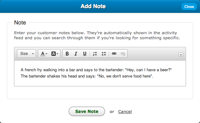 Add notes (with rich text formatting) about conversation, requests, feedback, or anything else you want the rest of your team to see. Instant Search lets you quickly find that important needle in your haystack of notes.