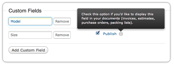 Additionally, you can check whether or not you'd like to display each custom field in your documents (invoices, estimates, p.o's, and packing lists).