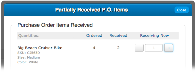 Mark a purchase order as "received", and the items from that P.O will automatically be added into your available stock. If the price per unit is different, we'll automatically calculate your "Averaged Weighted Cost" per unit as well as your latest cost per unit.